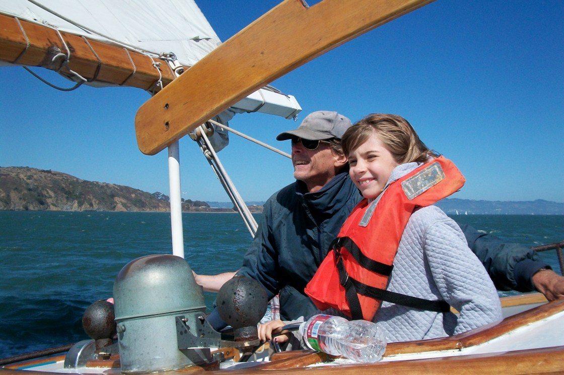 Youngest passenger, eight-year-old owlet MJ, was invited to helm The Bay Lady for awhile. She was, of course, thrilled, and under Captain Steve’s expert guidance even brought the sailboard “about” (I understand that term to mean “turn around”) and back to Pier 40. What a fantastic way to spend a sunny San Francisco afternoon! -jdf